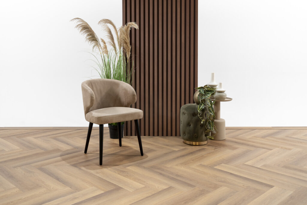 De planken zijn voorzien van een 4-zijdige V-groef, die essentieel is voor het strakke lijnenspel van de visgraat. Net als de rechte plankvariant is deze vloer geschikt voor intensief gebruik en bestand tegen zwenkwielen. Met brandklasse Bfl-S1 kies je bovendien voor een veilige vloeroplossing die technische kracht combineert met pure esthetiek.
